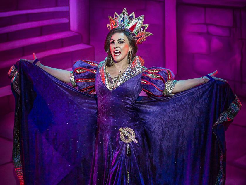 Shirley Ballas (main picture), released from her day job as head judge on Strictly Come Dancing, certainly knows how to make an entrance, and as the Wicked Queen she does here in a range of fantastic costumes. She swashes her buckle – well, swishes her frock – with aplomb.