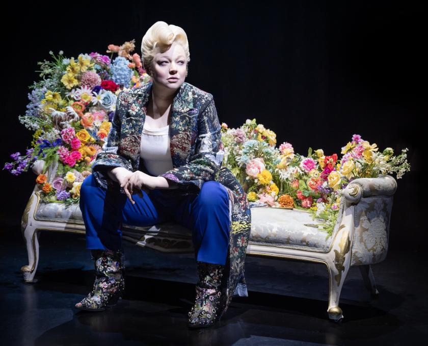 Sarah Snook in The Picture of Dorian GrayThe look of the piece is contemporary kitsch, with modern pop in the background and a full musical number, "Gorgeous"  for Dorian. Soon he is kitted out with a modish blond quiff and sparkly outfits Elton John might covet, as he moves into a decadent demimonde where young men easily come to harm. His name becomes synonymous with bad behaviour at polite dinner parties (with Snook amusingly playing all present) and his company is shunned.
