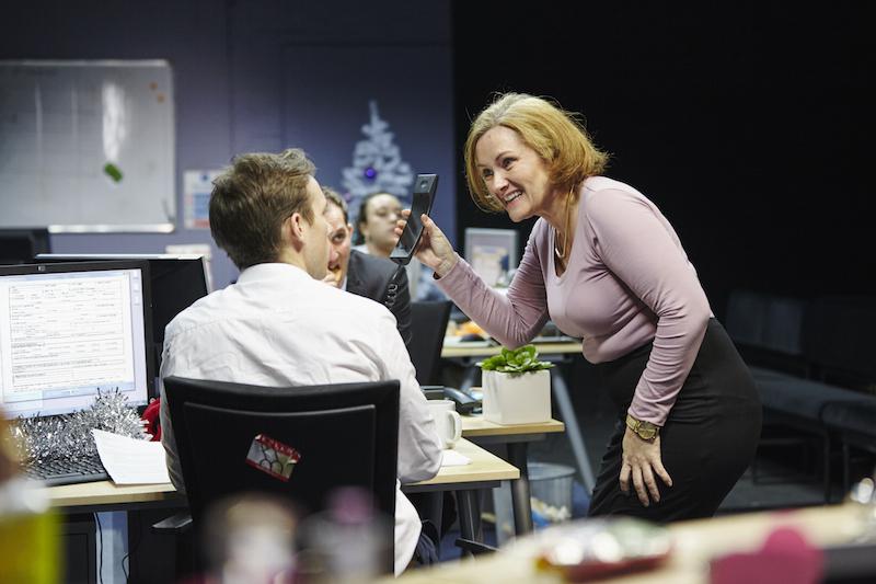 Saxon Court, Southwark PlayhouseLess compelling is Andersen’s raucous sitcom framework. The employees’ sniping banter is authentic and there are some wonderfully brash, striking one-liners, but multiple jokes are run into the ground; the scatological humour is particularly trying. Andersen also overuses the tonal shift from playful to sombre, meaning Donna’s threats lose potency. However, there are strong comic turns from Franklin, Brown and Hazell (pictured above), while Ellerby is poignant in her denial, and Melanie Spencers efficient traverse staging makes good use of the Southwarks Little space.