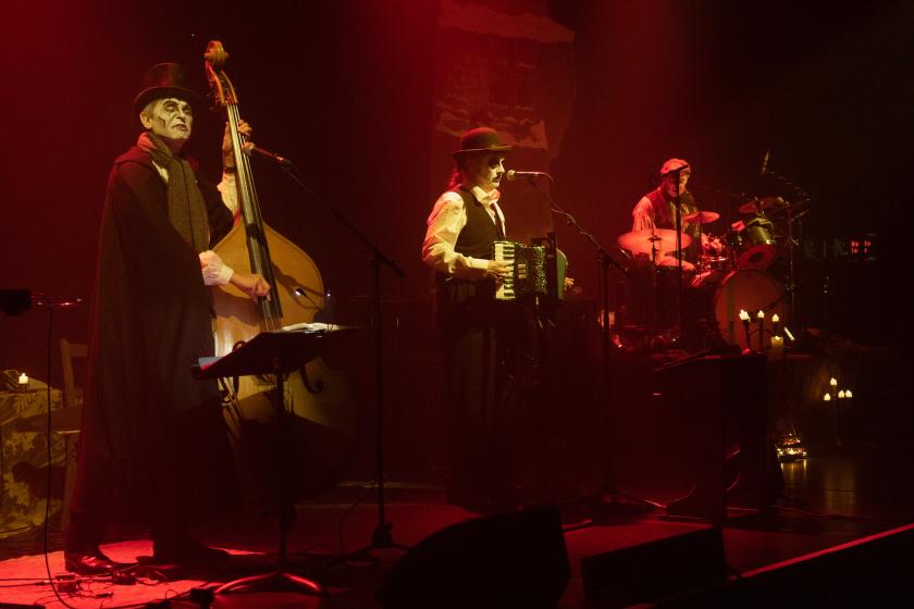 So it's no surprise to see The Tiger Lillies bring their unique sensibility to A Christmas Carol, Jacques' song cycle taking us into the head of the miser, Ebenezer Scrooge, paring the tale back to its psychological trauma and its bitter social critique. The Lillies' leader is front and centre, of course, but, with Adrian Stout snarling at latecomers and fearful of ghosts as Scrooge himself, and Budi Butenop playing a jaunty Bob Cratchit and mournful Tiny Tim, Jacques' bandmates prove to be much more than backing musicians.