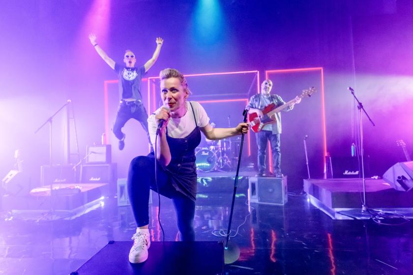Nevertheless, there are vivid details in Bissett’s account, particularly of the 1990s music scene (the Astoria was heaven, and the NME was God), and the band’s time supporting rising Britpop talent. Onstage musicians Emma Smith, Harry Ward and Simon Donaldson (pictured below with Bissett) also multi-role superbly, and there are amusingly spot-on impressions of Radiohead and Blur, plus clever use of period pop to back the stories. It might have been interesting to hear more of Bissett’s views on these relatively conventional posh boys, versus her original love of strong women smashing the system, but that feminist thread disappears.