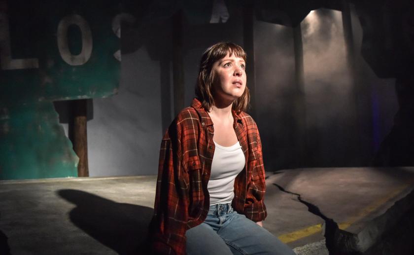 Latham nails the role, beguiling us with Maxine’s humour while never letting us forget she is a feral little hunter. She creeps around in jeans and a plaid shirt, peeping round the side-scenery on a stage with a broken Los Angeles traffic sign as a backdrop and a giant crack ominously running down its middle, at one point summoning down a pair of sneakers hanging on wires overhead (a Breaking Bad tribute? The excellent design is by Amy Jane Cook, lighting by Bethany Gupwell, sound design by John Leonard). Latham’s unadorned face is the ideal canvas for portraying Maxine’s unique kind of innocence, her button-nosed, wholesome features promising an everyday normalcy that life won’t allow her.