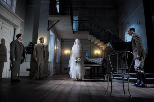 That's the dominant presence, as designed by Lizzie Clachan and Vicki Mortimer with the kind of atmospheric chiaroscuro from lighting man Jon Clark we've come to expect in a Mitchell dream-vision. Heywood's surprising counterpoint is established immediately by the crumbling Edwardiana of the Mountfords' threatened ancestral home on the left and the Arts and Crafts tastefulness of the Frankford manor to the right, clearly the home of a man who expects things to run smoothly.