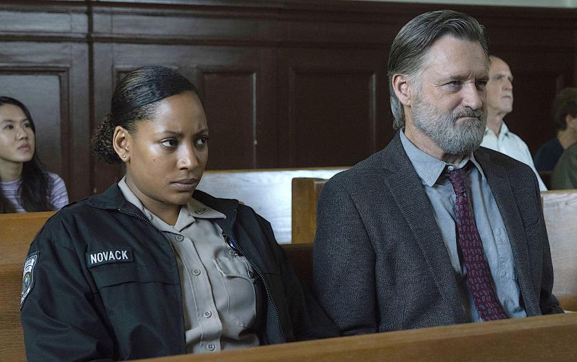But why did the kid do it? Clearly, he’s a little strange, and haunted by frightening visions of a cowled figure which advances spectrally towards him. When Heather first questions him he subsides into a spasm of gibbering terror which could be mistaken for demonic possession. The game changes, though, when a woman called Vera Walker (Carrie Coon, pictured above with Henig) turns up at the police station, demanding angrily to see her son. It transpires that the poison victims weren’t Julian’s parents after all, but colleagues (if that’s the word) of Vera at a commune out in the boondocks called Mosswood. This place has a reputation locally as a bad karma hotspot, and the police chief has a policy of staying away from it whenever possible. The whole area, densely wooded and thinly populated, gives off an air of foreboding. “There’s something in the soil,” Harry reflects. “Things won’t stay quiet” (pictured below, Pullman with Tracy Letts as Jack).