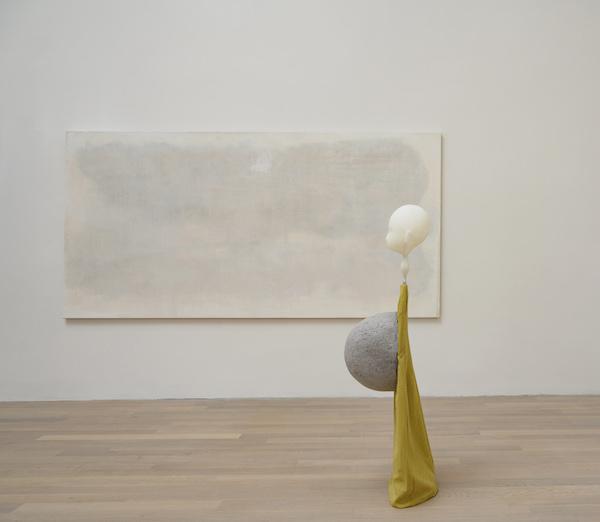 Dried flowers like offerings lie atop a gauze-covered rectangular frame. Pebbles surround its base alongside plaster casts, a desiccated dragonfly and an animal foot charm. Their placement is purposeful; their exact significance unclear. Four rib-high figures with moon faces, sausage string necks and wafer-thin bodies face the frame. Three wear golden gowns like devotees or disciples; all bear pendulous, darkly bellying stomachs before them over their clothes. From the first room of Northern Irish artist Cathy Wilkes’ installation for the British Pavilion in Venice, it is clear this is a highly personal exhibition.