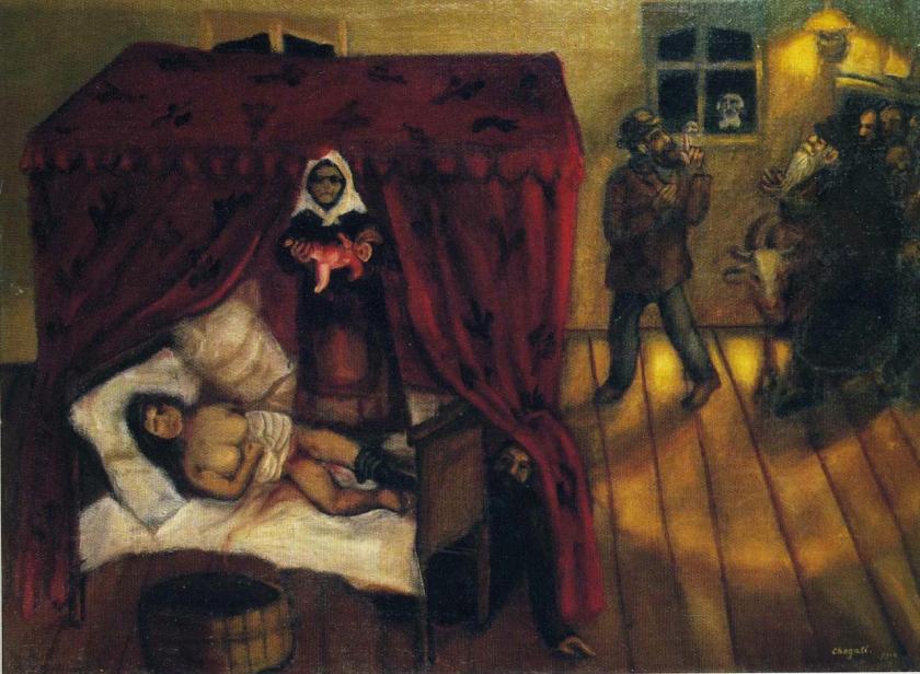 The exhibition, the first survey in the UK for 15 years ago, focuses on the years between 1911 to 1922, the period of his most intense creativity, though there is one earlier work, Birth, of 1910 (main picture), painted a year before he left for Paris, aged 23. Reminiscent of a crude Mexican votive painting, the dimly lit scene depicts a mother lying naked and exhausted on blood-soiled sheets, having just given birth. A grim-faced midwife holds the bloodied newborn, while the father cowers under the bed, partly hidden by the puce-coloured curtains pulled back as if opening onto a stage set. Pushing through the door and peeping through the window, which looks out onto a black night, are the villagers, accompanied by an ox, and a rabbi. Raw tenderness and slapstick comedy in one scene.