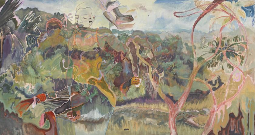 Take, for example, The Paradise Edict, 2019 (main picture), a tropical landscape whose diffuse colours and dreamy, hothouse atmosphere are reminiscent of a Gauguin painting. A crocodile basks in the foreground, its mouth gaping open, while behind it lush vegetation stretches to the horizon. This is the tourist brochure version of Africa; but the view is of Kiwaya, an island off the coast where regular clashes occur between Kenyan armed forces and members of the Al-Shabaab terrorist group based in nearby Somalia.