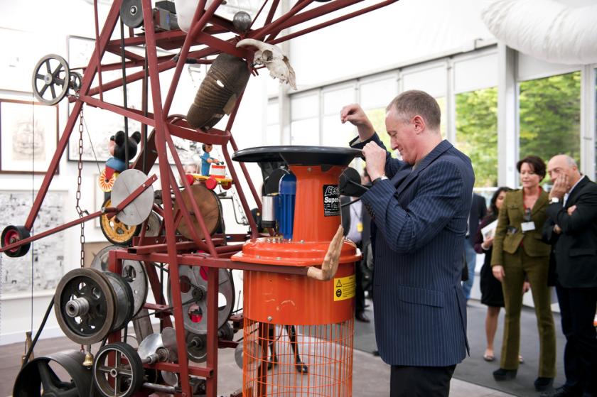 As for the rest of the fair, there was no shortage of eye-catching works, not least the artist Michael Landy and one of his mulching machines (pictured top), a 12ft contraption with saws and dolls' heads which juddered into life when the chomping motor was turned on. Landy wanted you to offer your credit cards for chewing up. Thomas Dane Gallery (F17) won attention with Landy but kept it with some great pieces, including a massive Glenn Ligon neon called Warm Broad Glow: it is just the two words "negro sunshine" writ large in a standard font; the pale yellow glow belies the harsh irony of the sentiment. Ligon is having a retrospective at the Whitney in New York and his reputation over here is growing every day.