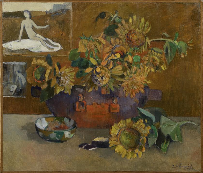 A decade after the death of Van Gogh, Gauguin had sunflower seeds delivered to Tahiti from France, which he planted and then arranged the flowers in honour of his old friend’s celebrated sunflower paintings. In Still Life with “Hope”, 1901 (main picture), the vase of sunflowers appears in front of a painting by Puvis de Chavannes and a print by Degas, and the effect is of Gauguin placing his friend among other esteemed artists, whose work they both admired.