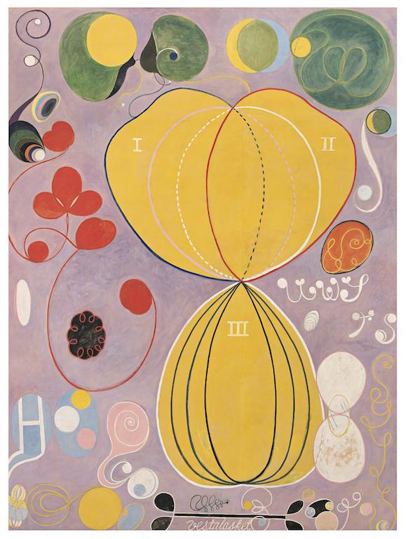 During one such gathering, Af Klint received “a commission” from a spirit master called Amaliel to create The Paintings for the Temple,1906-15, a group of pictures that were to be housed in a spiral shaped building. Over the next nine years she produced 193 pictures divided into series. “The pictures were painted directly through me,” she wrote, “without preliminary drawings and with great power. I had no idea what the pictures would depict and still I worked quickly and surely without changing a single brushstroke.”