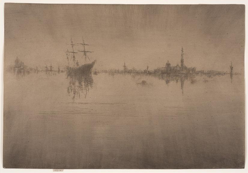 Some 500 etchings, and well over 150 lithographs were produced by this prolific and dedicated artist. They too exemplify his passionate attachment to the new ideas of art for art’s sake. He sought to transcend literal renderings in favour of emotional states and moods, however rooted in their visualisation to his acute observation and superb skill. Subtle as his art was, Whistler was verbally pugnacious and forthright, but paradoxically what is on view here shows his passion for realism as well as for atmosphere, and, contradicting his own complex positions, for emotion. Thus, everything in this marvellous anthology – some fourscore prints from his immense output – is recognisable, and the emphasis is on Whistler’s attachment to the aesthetic possibilities of the varying atmospheres of light, especially that of sky and water at all times of day and night, and how the scenes he focused on were illuminated. He was exceptionally adept at suggesting the intricacies of architecture, particularly elaborately worked façades, and skylines seen across vistas of water.