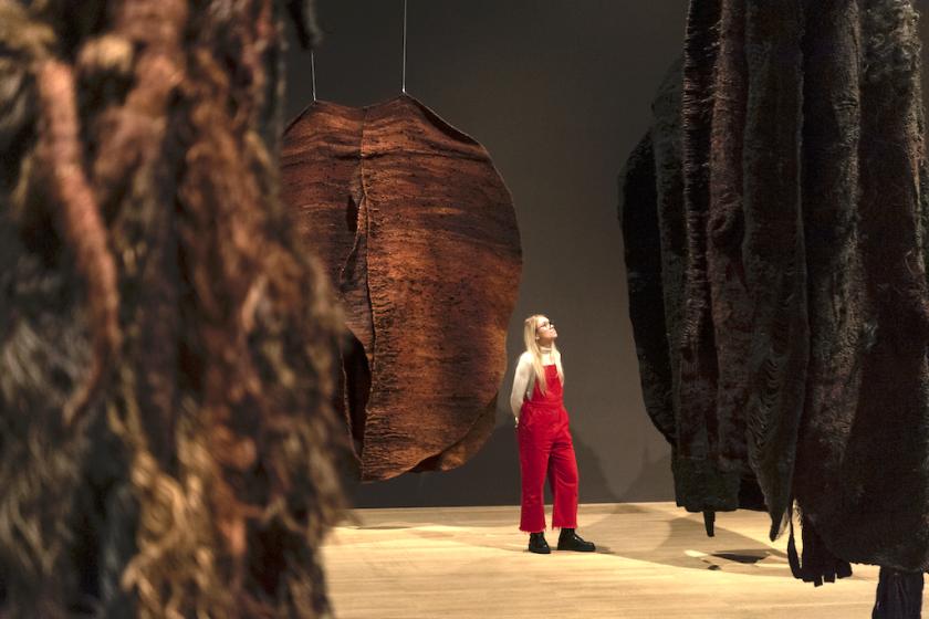 Scale is the key; the Polish artist did nothing by halves. Dominating the central space of her exhibition are ten magnificent forms (main picture) that hang from the ceiling to create a forest of darkly intriguing presences. Made from rope, sisal and horsehair died black or rich brown, they are reminiscent of hollowed out tree trunks, gargantuan cloaks or underwater creatures such as giant stingrays.