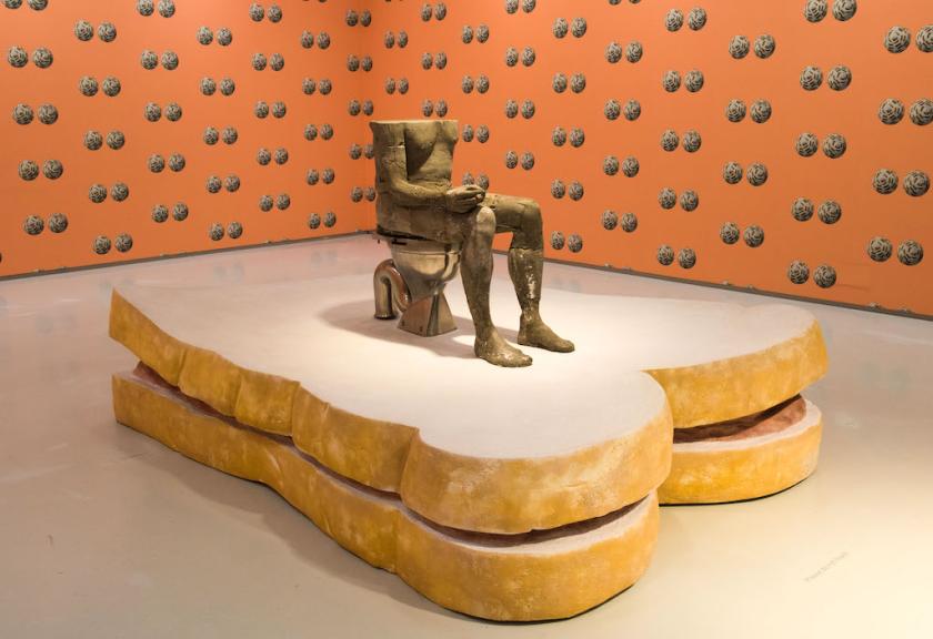 Joining them is Cnut 2004, (main picture) a concrete cast of dancer, Michael Clark sitting on a stainless steel toilet, fag in hand. The plynth is a giant sandwich of white sliced bread filled with spam. Made from Jesmonite and polystyrene, this po-faced celebration of processed food is convincing enough to make you feel as small as a Lilliputian. But why is a second sandwich included when space is so tight and there's a giant marrow in the room that could do with more space.