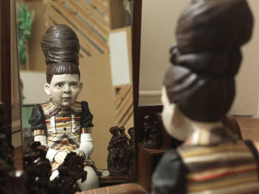 At Ditchling Museum of Art + Craft she has installed Doll for Petra, an arched cabinet display that revolves around a wooden mannequin made by Eric Gill for one of his daughters, also on display here. Since the local artist is widely known for abusing his teenage daughters, this gift has a very unhappy resonance. As if dolls weren’t already spooky enough.