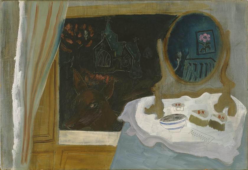 the window serves to heighten the sense of isolation, but also to introduce multiple viewpoints and picture planesThe intense loneliness of the picture is emphasised by Nicholson’s initials, “BN”, which are prominent on the items on the dressing-table, and the picture weaves Nicholson’s personal drama into the Christmas narrative. The view of the church, with all its connotations of congregation and rosy-cheeked carol-singers, serves not only as an emotional counterpoint but as a knowing reference to traditional nativity scenes, in which the architectural presence of the stable stands for the founding of the Christian church.