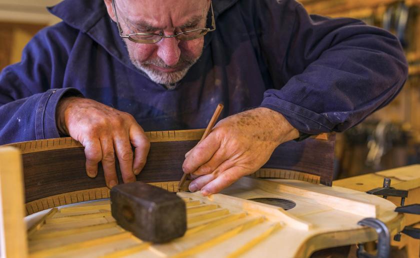 It's infinitely painstaking work, and he points out that, unlike violins, guitars eventually wear out and lose the original bite and freshness of their sound. A 300-year-old Stradivari violin still sounds amazing because "the violin is under compression all the time. It's a bit like a stone arch – if you compress it, it stays hard and the wood remains intact." A guitar, by contrast, is constantly under tension. "Wood isn't good at tension. It loses its ability to stay straight, it loses its elasticity. The great Hauser guitars of 50-odd years ago are great, but they're not as good as they were."