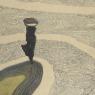 A young woman sits sewing (pictured below right: Young Woman Sewing,1655). She is totally immersed in her task, and our attention is similarly focused on her and every detail of her environment. The cool light pouring though the window illuminates her work and also gives us a clear view. She sits on a wooden platform that raises her above the cold floor tiles; on one side of her is a linen basket and, on the other, an ebony chair, its carved back and legs picked out with gleaming dots of light.
