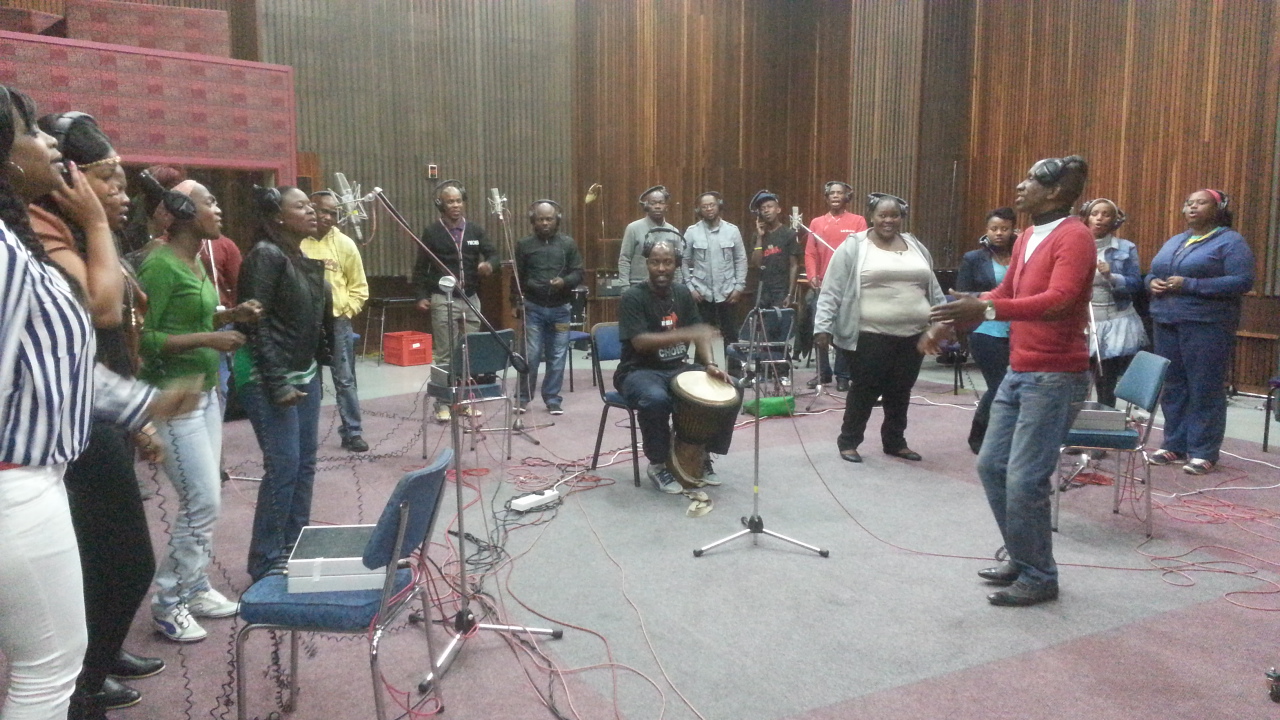 Adriano become the fifth member of the band, and he’s been incredible. He can play anything. His smile is a joy, and it’s just because he’s having such a good time. Everyone else was a wonderful extra - the main recording was put down by the core five or six at Yellow Fish Studio in Lewes (pictured below with Tony Remy and Henry Thomas), then the kora, trumpet and Soweto Gospel Choir (pictured left) so on added later. Several of the band were around at the beginning of world music in the Eighties, playing in a range of ensembles, so we have decades of world music experience to call on.