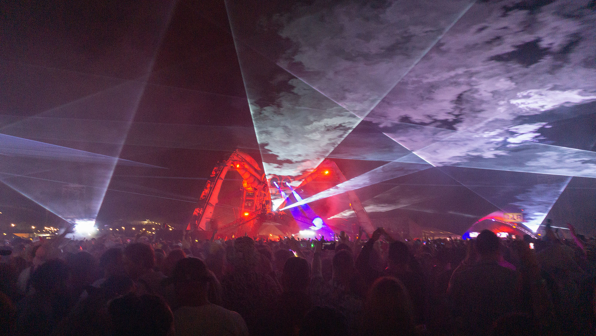 We stride away with Don and Finetime deciding what's next (it’s usually me but I’m easy after the miracle). Don stops at the Arcadia Spider, the 50-ton, 20-metre-high, three-legged steel'n'glass arachnid, built from the scrap parts of a TriStar jet, Gazelle helicopters and much else. Beneath its “eyes” is a glass encasement in which the Chemical Brothers are beginning their set on the Funktion One 360-degree sound system