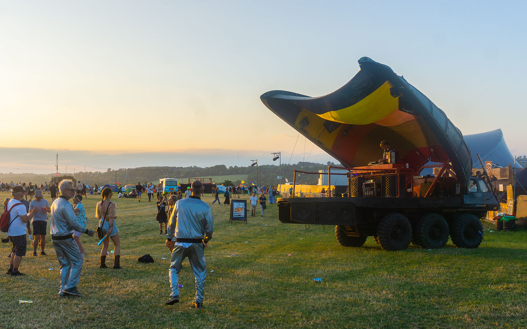 We stop again at The Bug, a military truck customized into a psychedelic open-winged beetle, lights blipping the dusk. On it, Groove Armada’s Andy Cato is playing back-2-back with a DJ called Spooky Cash-Cash who, from the look of it, is surely his teenage son? Cato sold the rights to his Groove Armada songs years ago to buy a farm, and has since, via co-founding Wildfarmed, become an activist for environmental change, exploring sustainable ways of growing cereal crops. None of that is helping him draw a crowd tonight, mind. But it’s in his favour.