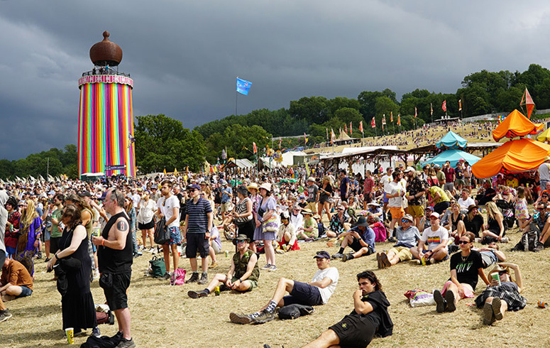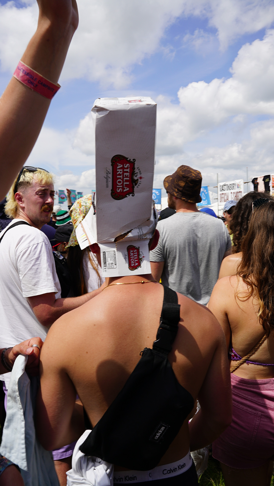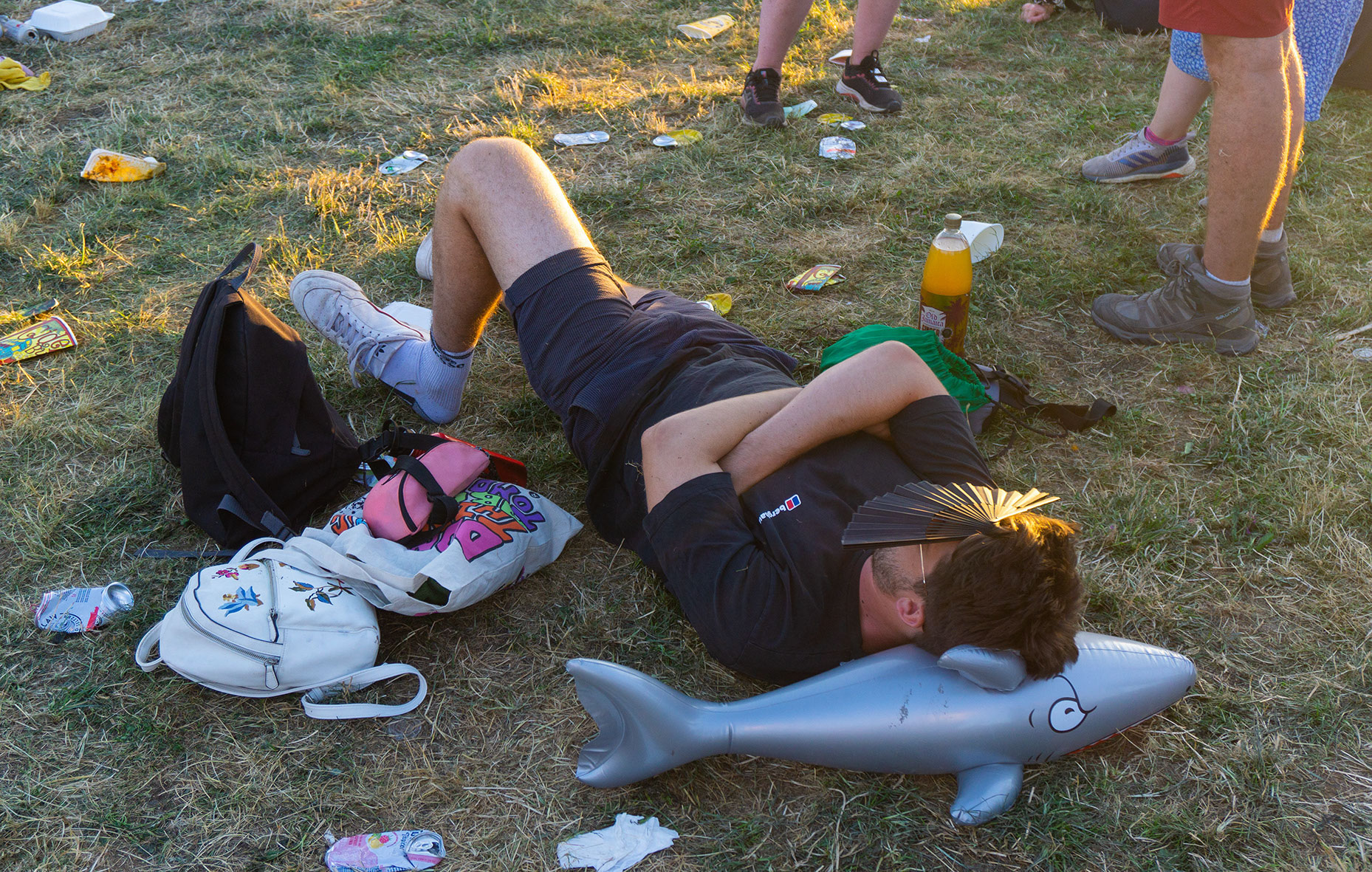 The only true oasis of actual cool air is a small, wooded glade overseen by the Iona Community, a long way from their Benedictine monastery just west of the Isle of Mull in northern Scotland. I’m invited in but am enjoying the sun. Surprisingly, there are only four people sitting there, all looking red, sweaty, sleepy and defeated. I return to Radha’s Grove and check in on Finetime. He’s ostensibly ready to move but, in fact, won’t be at full speed until after Lizzo later. I can’t help but speculate that some of the wipe-out might be down to Frisco’s goon’n’Quivver Fizz brekky. Both Finetime and Don vehemently deny this. But hmmmmm, right?