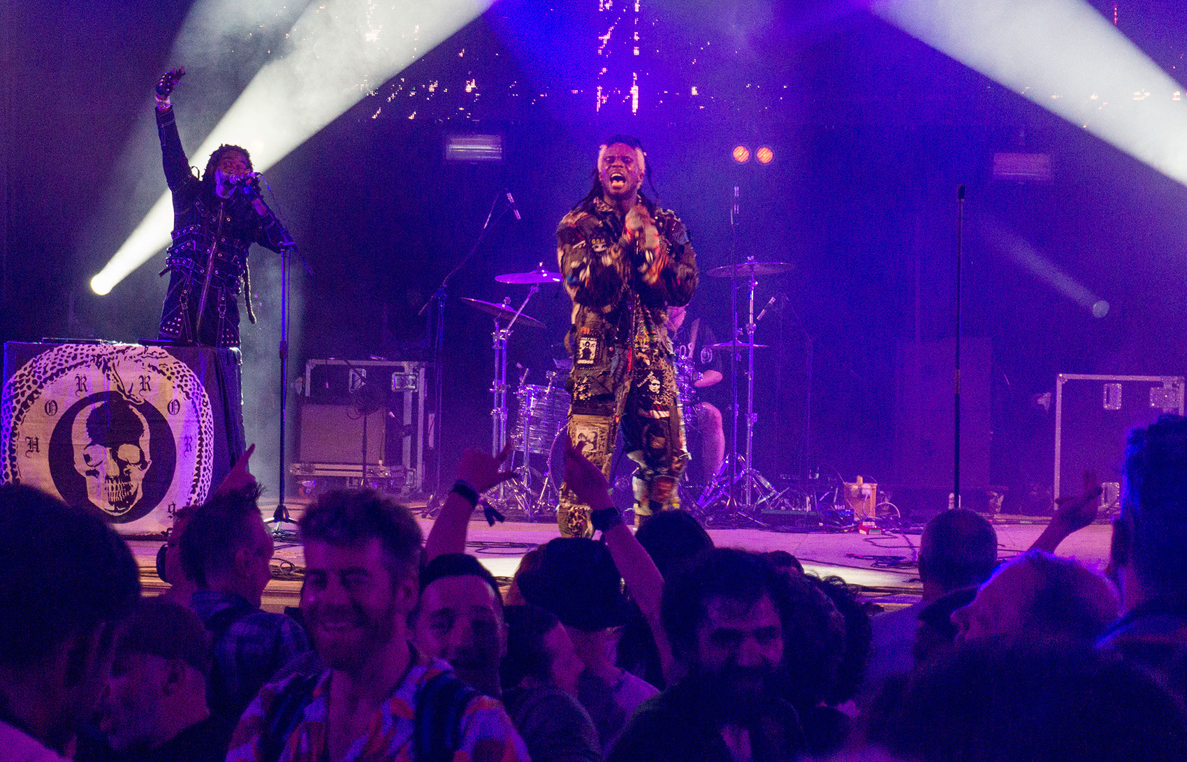 Our destination is the Truth Stage, right out in the far South-East Corner, where Earache Records have taken over for the night. We jig over there past endless bass wob-wob and huge billboards saying, “EVERYTHING MUST CHANGE”. It must. Arrive as Welsh dub-metallers Skindred finish but we’re here for uncategorizable New Jersey outfit Ho99o9. Festival perennial Chris Tofu is spinning remixes of classic heavy rock. We load up and fist-pump to beat-laden twists on “Ace of Spades”, ACDC and more.