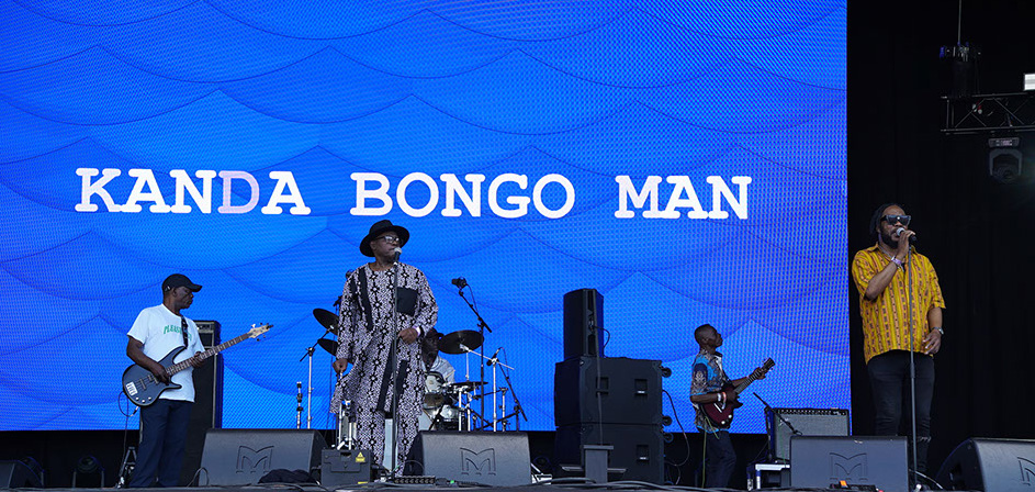 West Holts. Kanda Bongo Man is playing first. His happy treble Congo soukous guitar sound was a favourite of John Peel and his set, punctuated by his cries of “Allez! Allez!”, and the booty dancing of two ladies in white crop tops, is as delicious as it is apparently endless, a revolving, one-long-song emanating cheer under a cloudless sky and ferocious lunchtime sun.