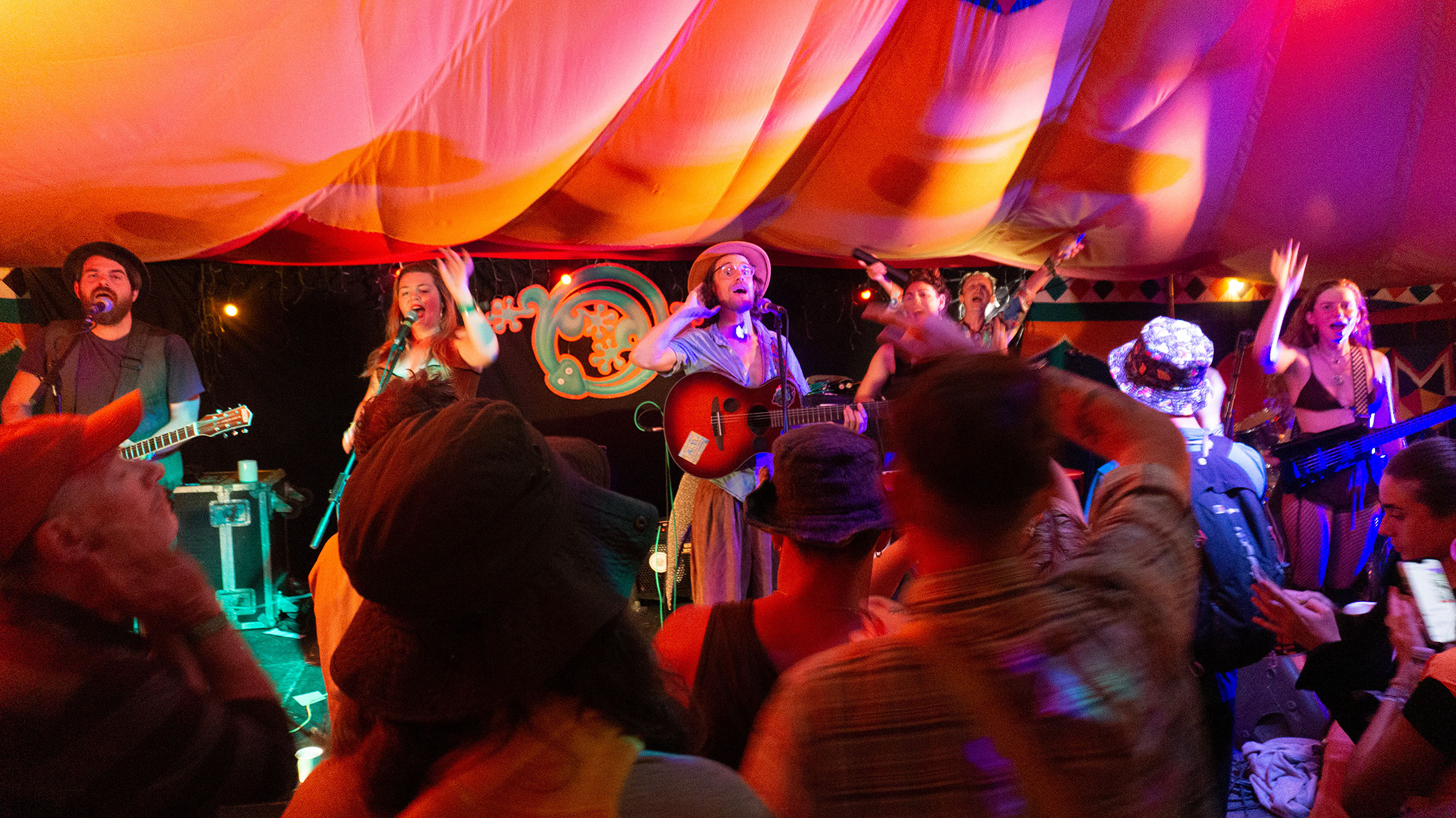 We sit in a rustic pergola nearby. Fizz and flap then push into the tent, now filling up. An open-shirted bearded dude in glasses, Duncan Disorderly is surrounded by lively women on bass, keys, percussion and much else. They’re doing a song about The Discovery Channel. Their fusion of Balkan, ska and folk clears the dozy from the floor and turns this carpeted Bedouin canopy into a bubble-pit of jigging. I briefly run into an associate I haven't seen for over 20 years. Sober these days, they recognise me. I am not. It takes a moment, but fritzes my circuits a little when I realise. Them doggone festival fates.