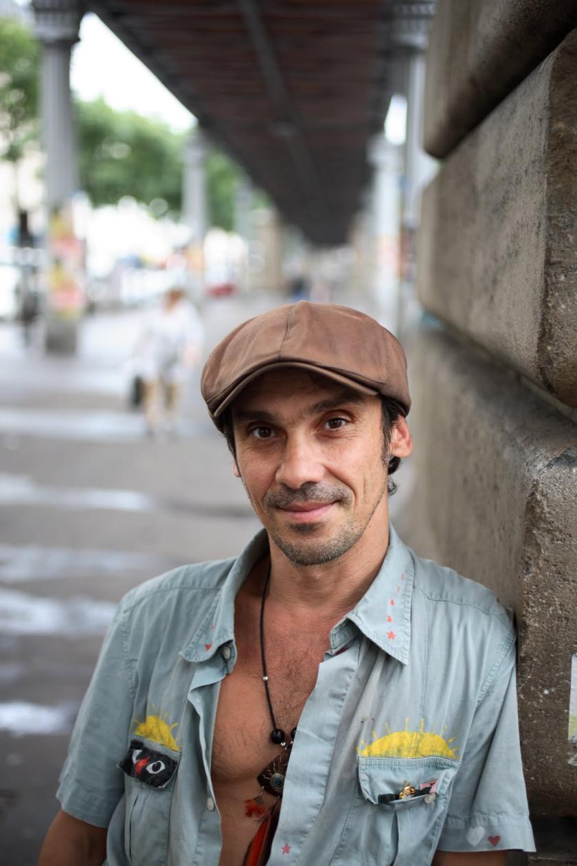 Manu Chao is “backstage” in a little makeshift tent on the green outside Brixton’s St Matthews Church (that’s the one opposite the Ritzy Cinema) and he’s certainly more at home than in some of the more conventional rock star places I’ve seen him in. Like Glastonbury, where he hated being in the VVIP area of the main stage with Amy Winehouse and Jay Z – all the fences and passes made him think of Palestine and he looked bored and dejected.