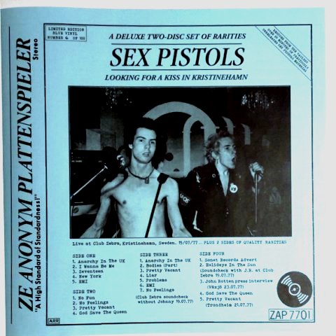 Shows from this tour are familiar. The Bad Boys and Anarchy In Sweden '77 albums appeared in shops in 1978 – the former of Stockholm 28 July 1977, the latter of Halmstad 15 July 1977. Drolly, the labels of Looking for a Kiss… (pictured below right) parody those of Anarchy In Sweden '77. This has better fidelity than the two 1978 albums and subsequent Scandinavian live sets, and is as sonically sound as the two shows collected on the 2012 Never Mind The Bollocks box set (Trondheim, 21 July 1977; Stockholm, 28 July 1977).