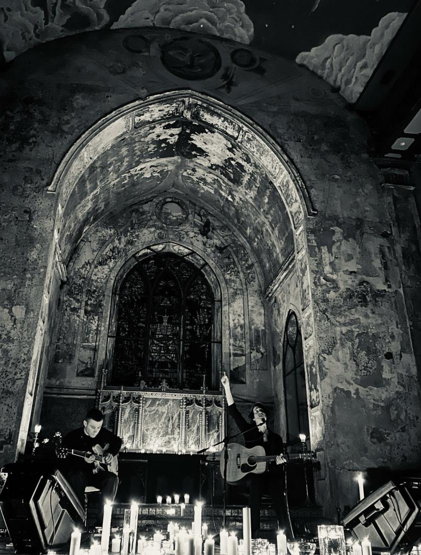 For a special show by the singer-songwriter Patrick Duff, this deconsecrated place of worship, provides a perfect space to present a mostly new set of remarkable songs, in which he explores with touching candour lost loves, the torment of a confused identity and disillusion with a world of over-reaching ambitions and lies. He’s lit the space, now a venue known as The Mount Without, with hundreds of candles, of different sizes, strategically placed to make the most of the building’s magical mix of gothic and neo-classical, the vaulted ceiling roughly painted with blue sky and swirling clouds, and a massive hanging sculpture, in the shape of the lemniscate – the infinity-sign – the symbol that crowns The Magician’s head in the Tarot’s Major Arcana. For this is indeed a show of pure magic, and, although the church has been de-commissioned, a celebration of the sacred that keeps us from sinking into the darkness – within and without.
