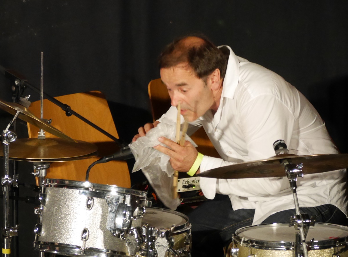 While Raab and Hegdal, on trumpet and saxophone respectively, together wrestled with the melodic line with brilliant fluency, the most exciting component of the band’s effectiveness, their rhythm, was left to the French pair of Godard’s tuba and Héral’s drums and electronics. Héral (pictured right) is a showman, and his performances tend to be intense and elaborate, especially his solos, which begin with a complex rhythm, which is then looped, while Héral improvises with both instruments and voice over the top. The other players have to stop while this takes place, so it usually only happens once per performance, but it’s a bravura act of giddy rhythmic complexity. One technique I hadn’t heard him use before was to ruffle a ball of plastic sheet over the microphone head, creating an intimate crackle. Each time he performs, there’s something new.