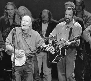 No. I think if I come up with something that I feel really committed to, if he has some reservations he’ll express them in some fashion, or he’ll just say well, this is great, but this is gonna be our circumstances when we do this. I can’t think of any particular record that one of us thought should be released and one of us thought should not. In the end it’s my music and it’s my work and I take my own risks. I guess I’ll filter some of the things through him and get his opinion and then see, as I do probably do say with [recording engineer/producer] Charlie Plotkin, somebody who’s worked with me for a long time, and a few of the other people. That’s sort of the way it works. It’s funny because it works pretty seamlessly, it works in some very natural fashion. All these things get sorted out in a very non-obvious sort of way. It’s interesting, I can’t quite explain it, y’know, but it’s probably been part of the key to the relationship. When we got together things just worked, and it felt very natural (Springsteen performing with folk-music icon Pete Seeger, pictured below).