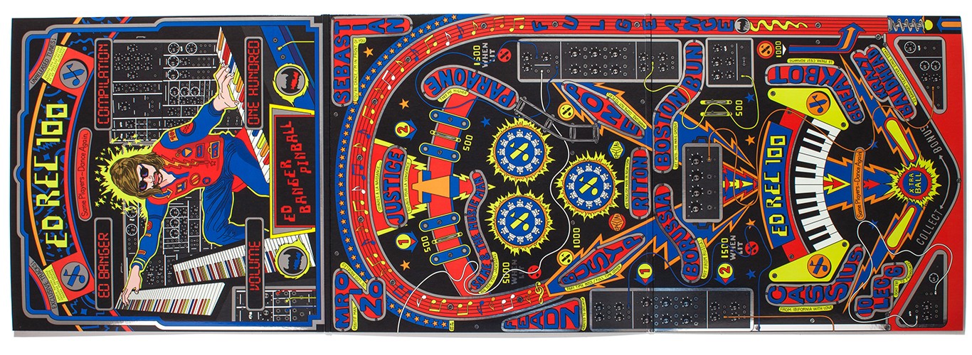 The 14 year old Parisian label celebrates its hundredth release with a glitzy, pop art packaged double album of exclusive new material from their roster, including Justice, Mr Oizo, Cassius and Riton. The primary colourful, silver-embossed cover art folds out into a triple gatefold that portrays a pinball machine with Ed Banger boss Busy P in cartoon form playing retro synths on the back-glass. The 18 tracks don’t sound like leftover off-cuts, such as many artists give their labels when such a project is muted (the exception being the Boys Noize micro-remix of Justice’s “Randy”). Overall, the selection shows how far Ed Banger has moved from their original caustic electro-attack sound. Tunes such as Breakbot’s Boosty Collins-alike girl-sung “Mystery” and Cassius’s equally easy “Fame” show a Random Access Memories-ish commercial potential but perhaps more interesting are tunes such as Pone & Boogie Vice’s strange downtempo stoner synth-hop “Ricky the Can”, Riton’s blissed electro ballad “Temporary Secretary” or the demented vocoder cut-up of 10LEC6’s “What Dat Azz Do”. Here’s to another 100!