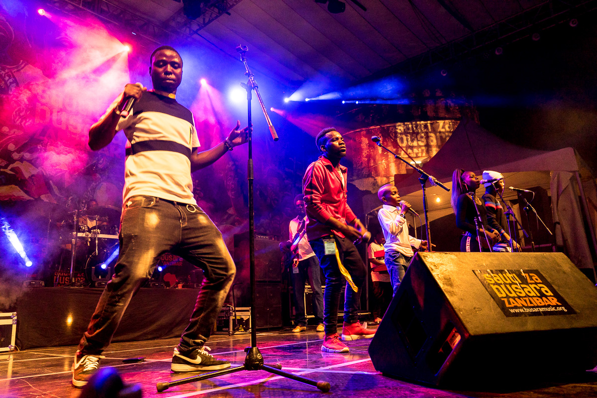 On the main stage a band from Dar-es-Salam called Mbukwa Na Wanawe Crew (pictured above) are cycling through an set of Afropop, rumba and bongo flava, the stomping Afro-disco hip hop sound that has dominated the Tanzanian charts for the past decade or so. Mbukwa are more of a collective than a band, with a long history of nurturing talent to stardom. The prime contender in this year’s line-up is a small boy by the name of Abdul ‘Dogo’ Kadry, whose vocal chords bring a young Smokey Robinson to mind and milk the audience of its reserves of cheers and applause. Mbukwa is what’s referred to locally as ‘hot’ music; its rhythmic, sexual and materialistic energy busts the thermostat, quickening the heartbeat of young zenjiboys and zenjigirls. It’s also the kind of music that the guardians of tradition categorise as a threat, a little too readily perhaps.