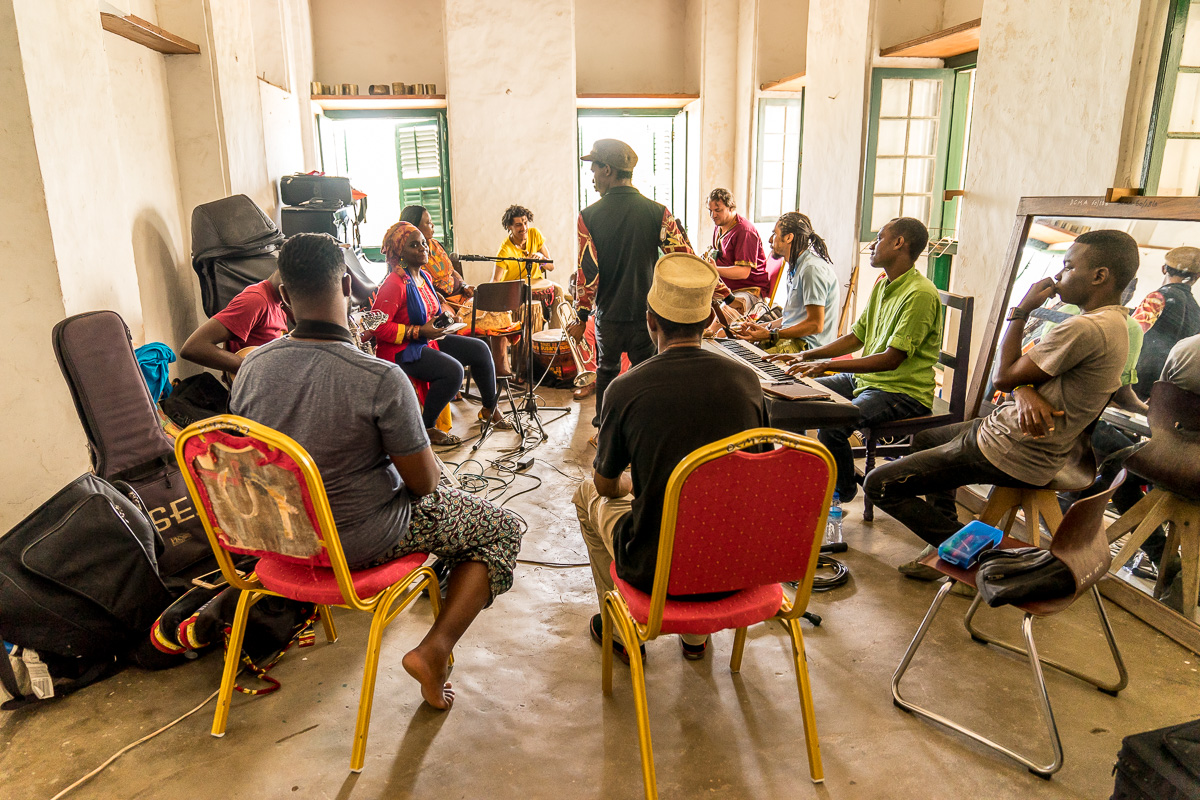 Aliko takes me to the room where this year’s embodiment of Swahili Encounters, an annual DCMA project that brings together musicians from all over Africa, are rehearsing for their Sauti za Busara show. South African trumpeter Mandla Mlangeni is standing in the middle of a circle conducting musicians from Kenya, Sudan, Egypt, Algeria and Tanzania (pictured below). The atmosphere is taut with the pressure of the looming show time. “Some of my friends are coming round now,” Aliko explains, continuing his story and we walk up the to the upper floor of the building, “It's down to embarrassment. They were embarrassed by their own culture. And that attitude comes from colonialism. It bought us Christianity and Islam and took away our culture. It told us our heritage wasn’t worth anything.”