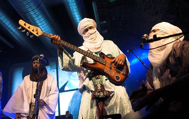 An aura of mystique surrounds Tinariwen. The members of this group’s shifting line-up are from the Tuareg people, nomadic Berbers of the North African desert regions, and several have taken part in armed Tuareg rebellions in the past. This air of mystery is enhanced by their garb – flowing robes and extravagant headdresses that mask most of the face (though singer/guitarist Ibrahim Ag Alhabib keeps his head – and his fabulous frizz of hair – uncovered). Their music, too, has a mystical quality, its repeated refrains acquiring a cumulative hypnotic potency.