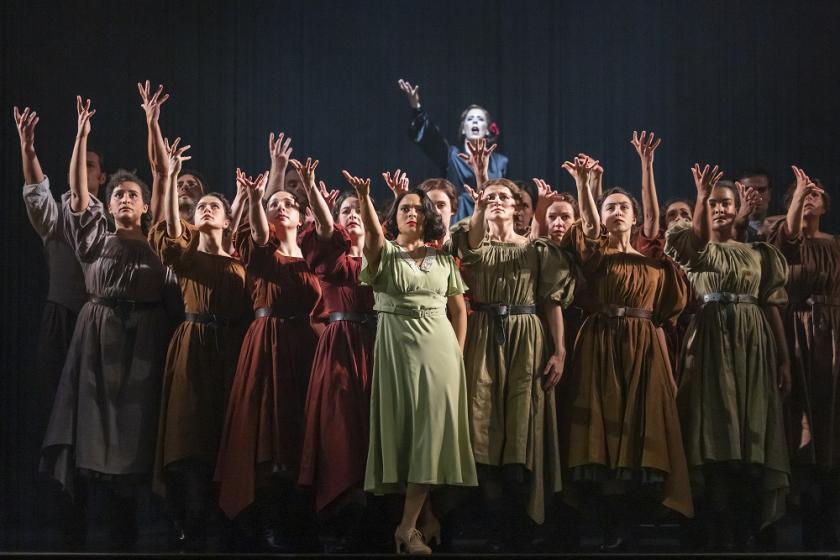 The quartet of flamenco dancers whom we see on stage is commanding and captivating, but there’s great movement work displayed in the chorus too, as they swirl and stamp in synchronicity to Golijov’s ingenious score. The orchestra is on glittering form under the ever-adept baton of Stuart Stratford, capturing the music’s multifaceted ebbs and flows. Designer Jon Bausor’s set is particularly effective, with a circular curtain made of the frond-like strings of the fringe of a flamenco scarf dominating the stage, on to which text, light and video are superimposed. The lighting and visual elements are cleverly and tastefully executed, often in a way that further extenuates the blurring of boundaries between past and present, fact and fiction, memory and reality.