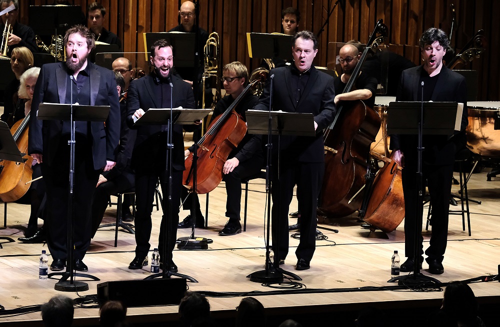 Alice (Barbara Hannigan, high-wire Barry favourite) squeaks out scales and arpeggios in competition with an orchestra which, as in Earnest, favours brass and wind as she plunges down and down; the ever-virtuosic and clarion Allan Clayton switches in a second from White Rabbit to join the three other male voices as Bottles - "Drink!" - and Cakes - "Eat!" (pictured below: Clayton, Peter Tantsits, Mark Stone and Joshua Bloom).