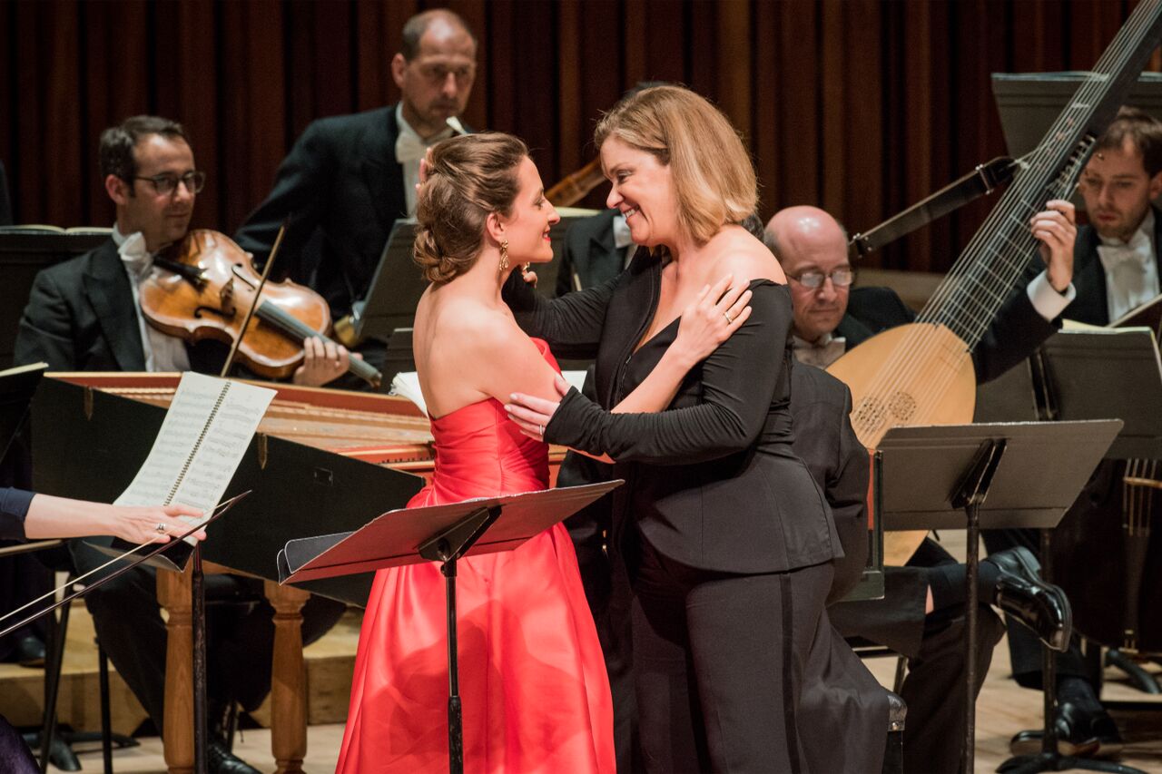 It’s almost a relief, then, to see a performance stripped of these, allowing the music’s mercurial moods to dart and shift unfettered. No director was credited, but, as usual with the Barbican’s operas-in-concert, there was plenty of movement and interaction from performers, singing largely without scores. No one witnessing the predatory seductions and gropings of Sonia Prina’s villainous Polinesso (pictured above with Mary Bevan's Dalinda), nor the abject despair of Matthew Brook’s King, collapsed to his knees at the thought of his daughter’s betrayal, could have felt dramatically short-changed.