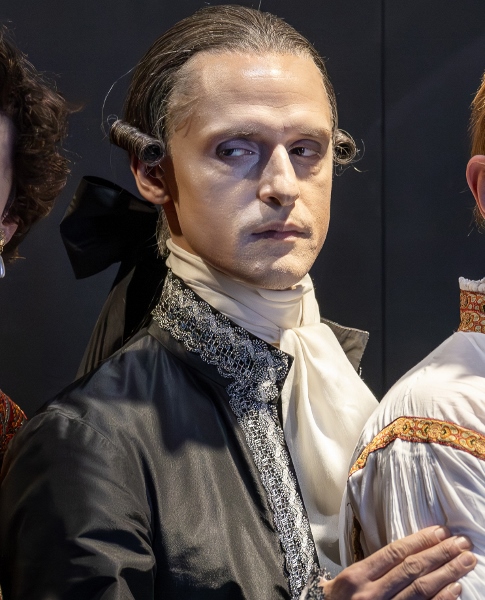 It all begins with Don Alfonso (Quirijn De Lang, pictured above right) on the stage at the start of the overture, be-gowned as if about to impart instruction (the piece is sub-titled “The School for Lovers”, after all). Dumb-show during the overture is almost conventional these days, but it doesn’t need to last long and once the tempo picks up he disappears and leaves it to Mozart to brighten the mood. Clemens Schuldt conducts with assured grace and constant vitality: he looks after his singers and obtains moments of great beauty from the orchestra.