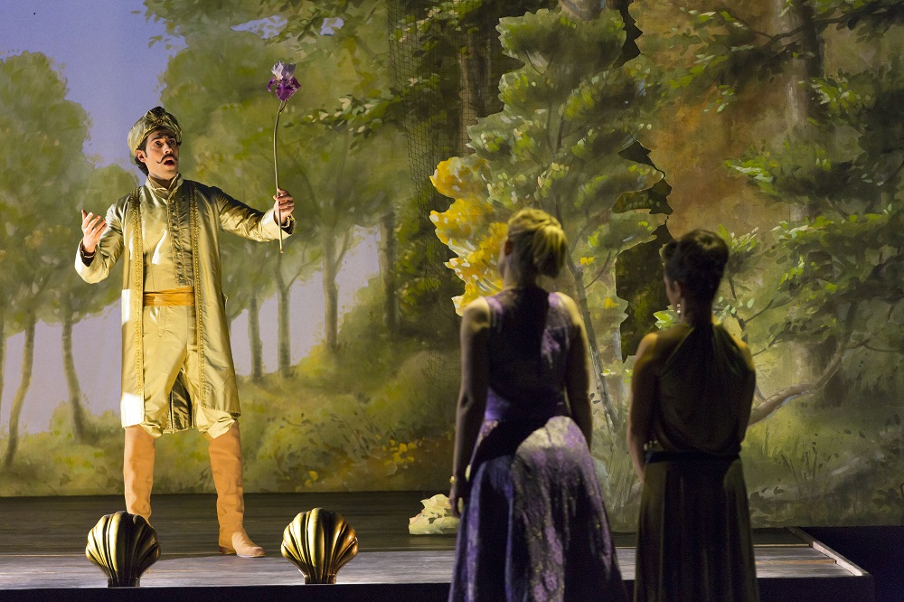 Ben Bauer's set designs, Karin Jud’s costumes and Bernd Purkrabek's lighting do a lovely job of an 18th century stage with bosky painted flats to launch the Act Two seductions (Alessio Arduini, Angela Brower and Winters pictured above), though the climactic duet on top of a hydraulic dressing-room scene isn’t easy to make out, at least from where I was sitting.