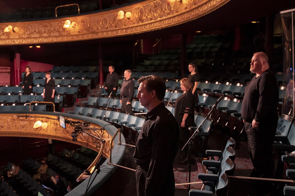 A young cast of Scottish Opera Emerging Artists took these unusual performance circumstances in their stride, the Act 2 duet between false lovers Dorabella (Margo Arsane) and Guglielmo (Arthur Bruce) exquisitely tender and slightly more convincing and better matched than the equivalent outpouring between Fiordiligi (Charlie Drummond) and Ferrando (Shengzhi Ren). Despina (Catriona Hewitson) was allowed some comic latitude, singing the lawyer’s plaintive lines excruciatingly out of tune. A chorus of 12 appeared occasionally, standing in the grand circle two metres apart from one another (pictured above). The other Covid stuff worked pretty well. The stage had two-metre squares drawn out and at no point was any member of the cast sharing a box with another. Drinks, champagne and tea, were poured at arm’s length and there was enough movement to make the two metre squares seem incidental, not structural, avoiding any sense that the characters were stuck in their boxes The doctor came on to attend the poisoned lovers in a mask (of course, but soon removed) and NHS uniform, and the vast magnet used to revive the victims was capable of doing so at a compliant distance.