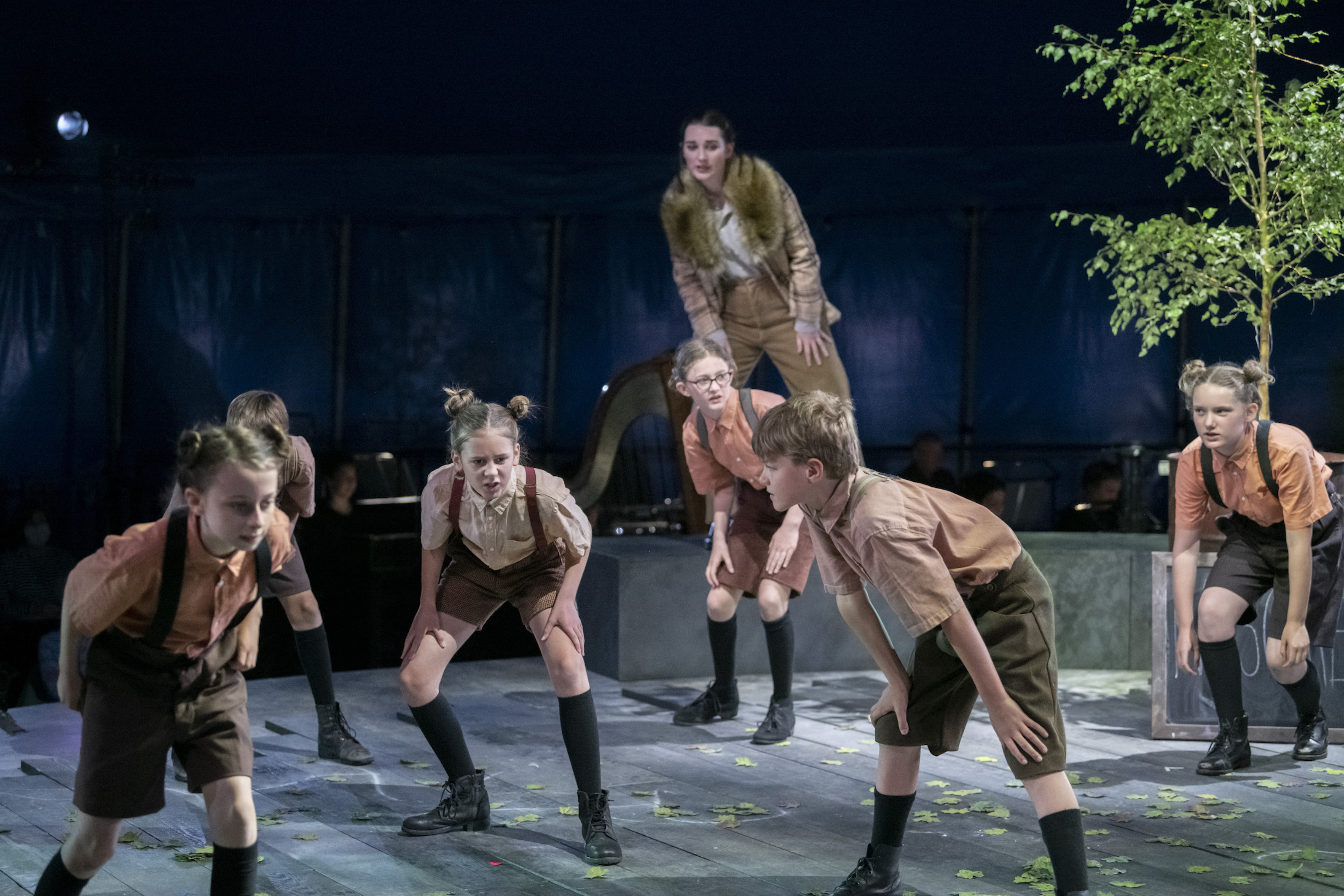 But the real spirit of the production lies in the comings and goings, the creatures great and small (not always clearly identified, but no matter), the cockerel (Lucy Mellors, excellent) and his hens, whom the feminist vixen lectures about their subservience to a conceited male but then proceeds to slaughter the lot of them, and not least the procession of fox cubs in the last act (pictured below with Frances Gregory) (“how many have we had?” asks the fox; “I’ve lost count,” replies the vixen). Which is important, by the way, because the season comes round with a new fox and a new vixen and the world is the same, oblivious of us humans and our anxieties. The aptly named Ms Fuchs handles all this with consummate resourcefulness, helped by Nate Gibson’s economical but witty designs, full of light touches, the scattering of leaves, tables and chairs put to all kinds of use, as one might do, much more clumsily, in some improbable home Vixen. The children are superb; but they would be, wouldn’t they?