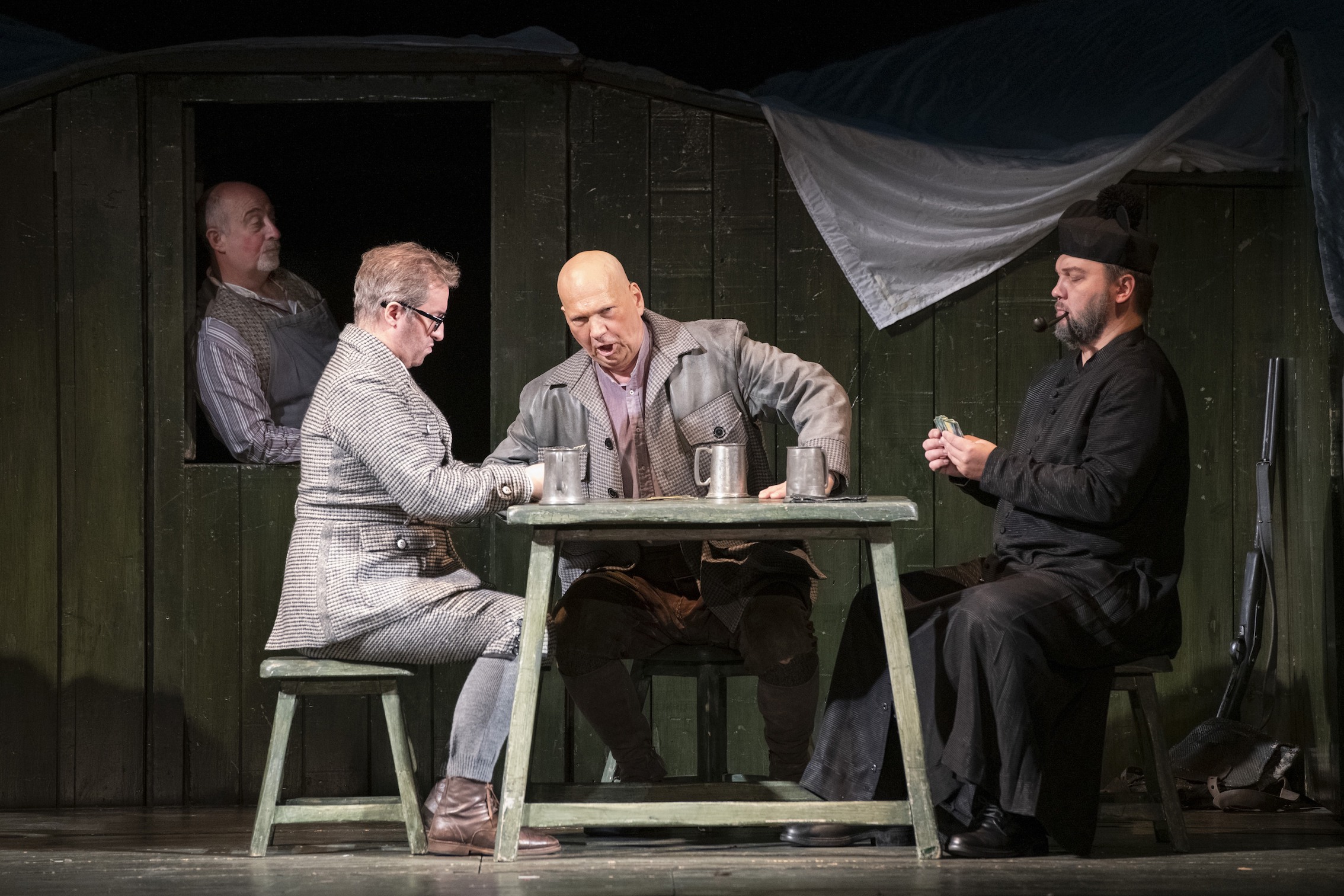 All the same, the singing – in Czech, for the first time here – is both eloquent and stylish. The Northern Irish soprano, Aoife Miskelly, sparkles as the Vixen, as athletic vocally as she is physically, jitterbugging around the stage in authentic twenties fashion. Claudio Otelli is likewise an outstanding Forester (pictured above, centre, with Martin Lloyd, Peter Van Hulle and Wojtek Gierlach), in big, vibrant voice, and giving the impression of having spent his entire life in the woods with a gun in his hand. David Stout repeats his sly portrait of the Poacher Harašta, who does, it seems, marry Terynka, but surely not the same one. Peter Van Hulle is a splendidly bibulous schoolmaster, Lucia Cervoni a smooth, stately soprano fox, the sort you might (unwisely) trust with your chickens.