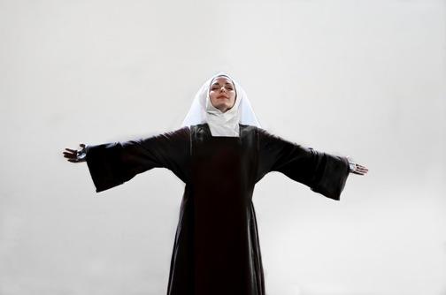 Director Stephen Barlow pulls out the ultimate stops as Blanche rejoins the sisterhood on the scaffold as the last of the martyrs. The image of the shattered carriage window which launches and dominates the work, variously lit as burning coals and spider's web, slides back and a self-respecting soul is left alone in light, arms raised. I can see the point, but that's my other question mark about space, this time the inner state of grace made visible - it really needs to be there for the whole of the "Salve Regina" sung by the sisterhood (pictured right) as, one by one, they succumb to the fall of the blade (the sound of which, incidentally, was not as shocking as it can be). Barlow echoes, up to a point, the unforgettable symbolic gestures of Robert Carsen's peerless production: here the nuns let their prayer-clasped hands fall to their sides as they "die" at the front of the stage, while the guillotine and a not very convincing group of revolting peasants do their stuff, or rather some rather indecipherable kind of stuff, at the back. This would surely work better as open space for all the other women's liberation, too.