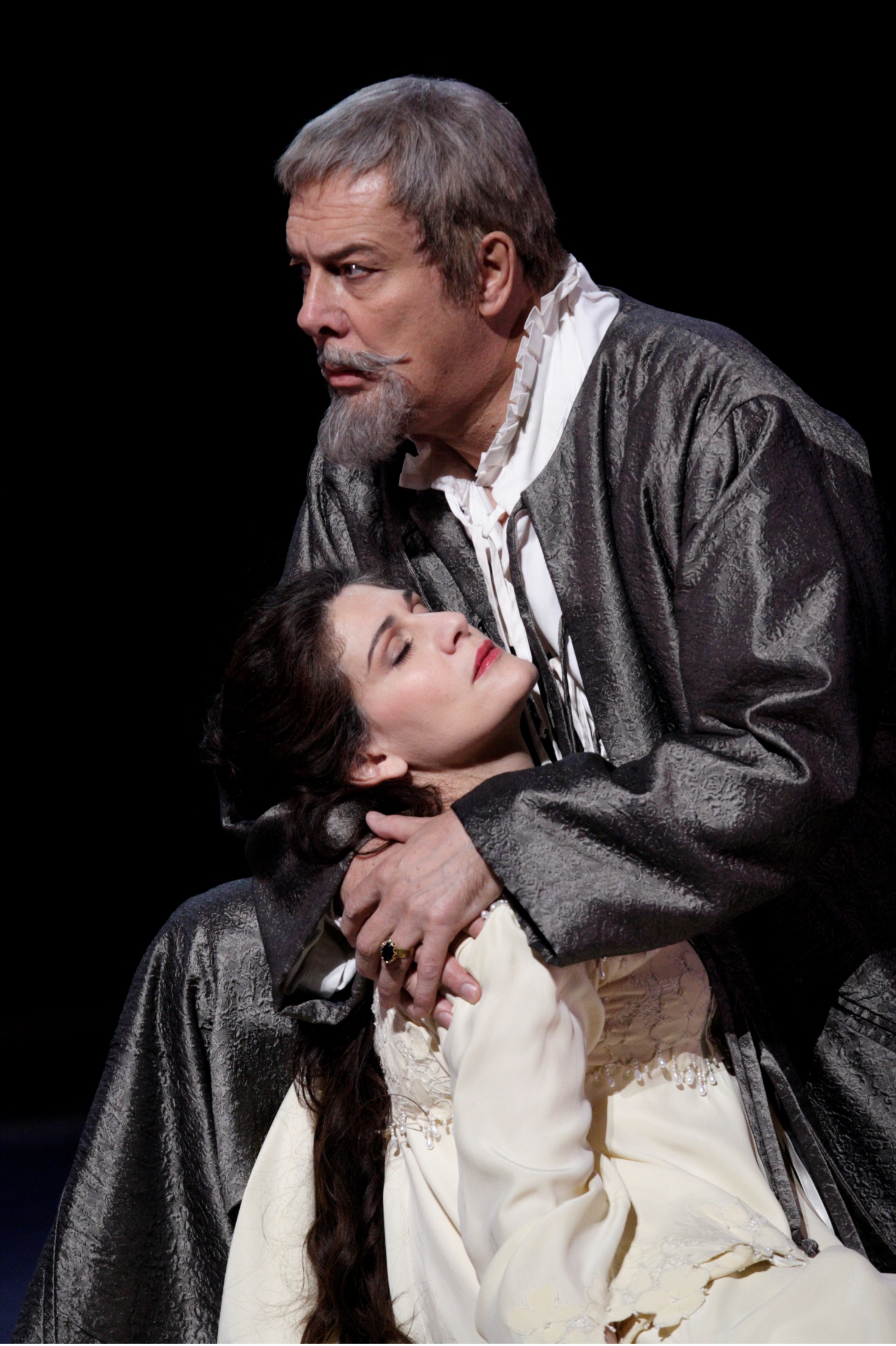 It's now apparent that in Anja Harteros we have another ideal Verdian: floating a line with luminous assurance, forceful in dramatic exclamation and perfectly at ease in her body, fully revealing the pain and difficulty with which regal composure is achieved. Ferruccio Furlanetto's Philip (pictured below with Harteros) is already a known quantity, but he has added to the depths of a tyrant only Verdi could make sympathetic. The beginnings are already there when a sob, a crack in the voice reveals his anguish to Rodrigo, the son he would have wanted.