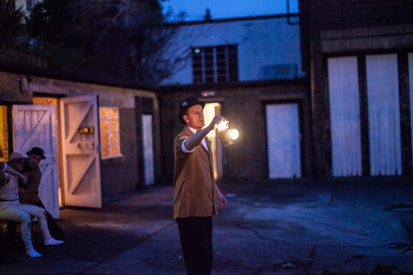 The site-specific performance took place in the inspired location of a disused brewery depot in Lewes. The show started in the concrete yard, as the audience arrived. Nine bedraggled women quietly sang folksongs before moving in formation through the audience. St George (James Garnon) arrives on horseback, in a green string vest; a shaven, blindfolded prisoner arrives on a chain from the stables where he is kept. Four bowler-hatted and bow-tied Fight Club Men make preparations for a fight between St George and the shaven prisoner known as The Slasher (Nick Tigg). This is all before any music has started, except for an occasional tolling bell and gentle drum beat.