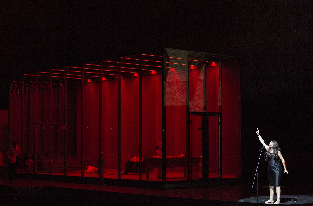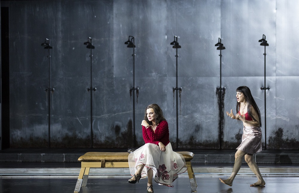 The style is at odds with Lithuanian soprano Aušrinė Stundytė’s utterly convincing portrayal of an Elektra as on the brink of madness, all flashing eyes and inconsolable brooding, one who despite a few sassy tango steps in her first monologue clearly won’t be able to execute her dance of triumph after her brother’s murder of mother and lover. Stundytė, hitting all the top notes spot-on, can certainly sing the part, and the text is perfectly projected, though her husky sound takes some getting used to. Elektra-Chrysothemis scene in Salzbyrg ElektraIt’s perfectly offset by the soaring lyric soprano of Asmik Grigoryan (pictured above on the right with Stundytė). Her Chrysothemis is the sensible sister, though not the usual compromiser: tough, sassy and much more practical when it comes to the aftermath of the murder (what’s going on in the glass-box house distracts a bit from Elektra’s final monologue). There’s a plausible suggestion that Aegisth (Michael Lorenz) has been abusing his step-daughters. Even so, that scene of Elektra’s false greeting doesn’t work so well, and very often there are distractions from the one-to-ones; not so in the great Recognition Scene, where Derek Welton is utterly plausible as an unusually sympathetic, terrified and emotional Orest. Warlikowski’s handling of how brother and sister come so close to holding each other, but just can’t do it, is humane and convincing.