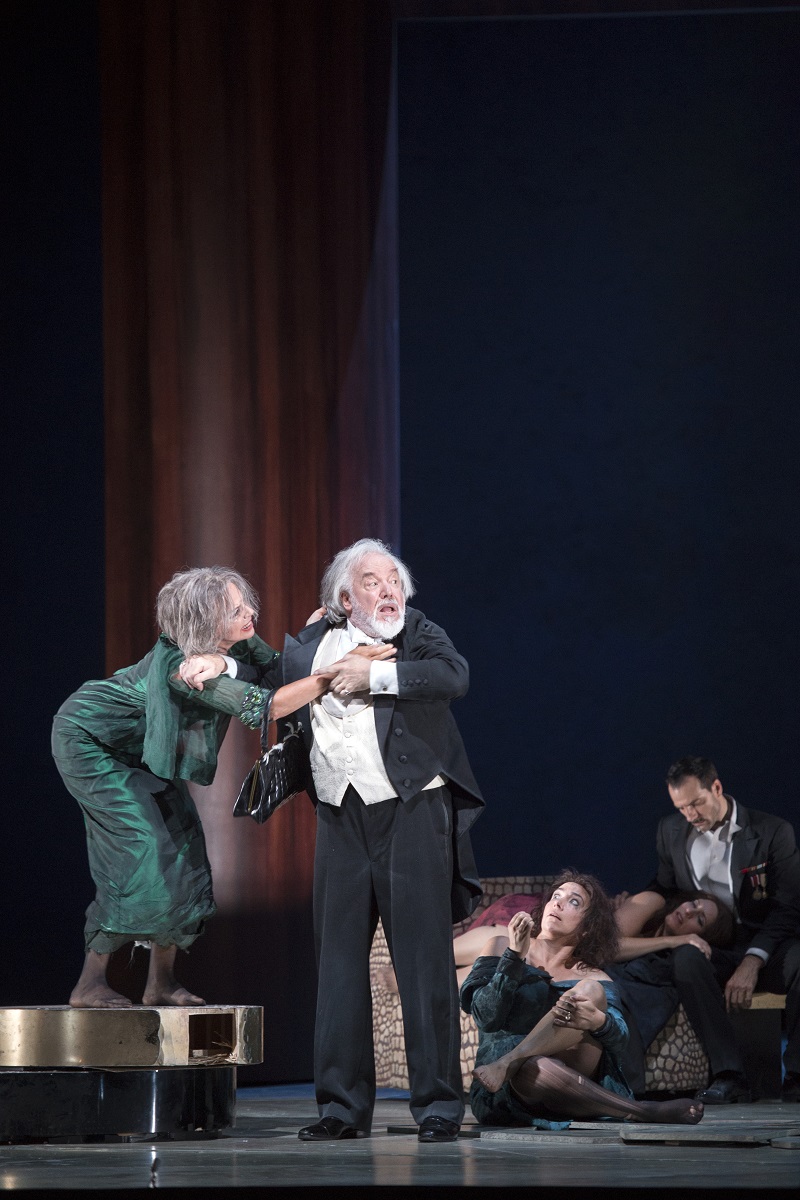 Act One is a confusion of ensembles - the greater precision of a Richard Jones as director would have pinpointed who's who more deftly, and probably been funnier - but eventually Adès gives ariettas and duets to personalities he wants to highlight. Making the most memorable impression are one of our greatest mezzos, Christine Rice, as the pianist Blanca Delgado, who sings a setting of Chaim Bialik's "Over the Sea"; countertenor Iestyn Davies as the neurotic, sibling-obsessed aristocrat Francisco de Ávila with his little number - quoting or pastiching what? - about inappropriate teaspoons for coffee; and Anne Sofie von Otter, back on top form after some dubious excursions, as a dying woman who gets a mad scene straitjacketed by guitar accompaniment (pictured above with John Tomlinson, Christine Rice and Frédéric Antoun).